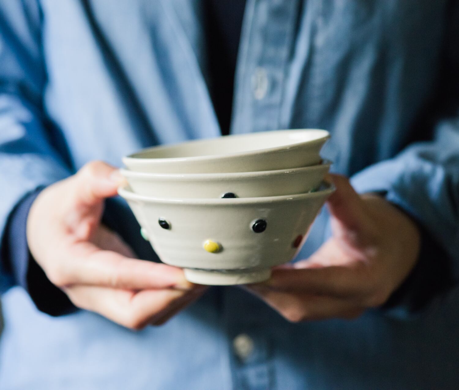 マーブルチョコのようなカラフルな色絵の飯碗。