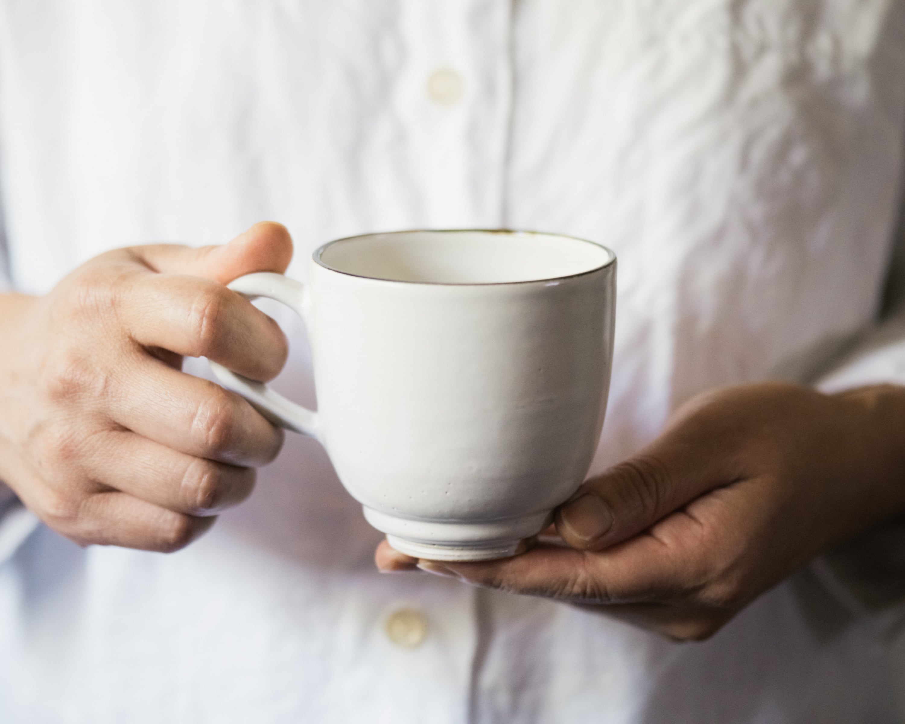 下部にほどよい丸みを持たせることで、手に馴染みやすく、やさしい手触りに仕上げました。飲み口の繊細なラインと落ち着いた色合いが、日々のコーヒーやお茶の時間をより心地よいものにしてくれます。